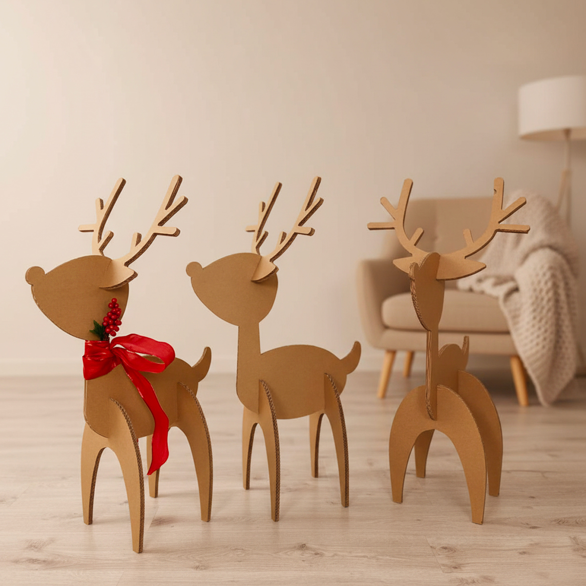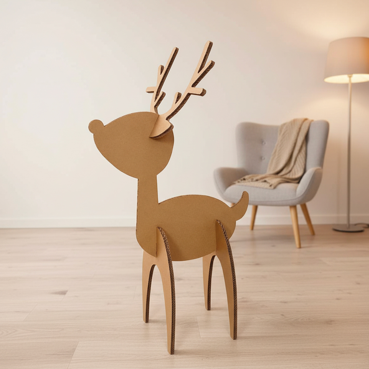 Añade un toque de encanto y sostenibilidad a tu decoración festiva con nuestro reno de Navidad de cartón. Es la figura auxiliar ideal para acompañar tu árbol, perfecto para aquellos que buscan una decoración navideña sostenible y totalmente personalizable.